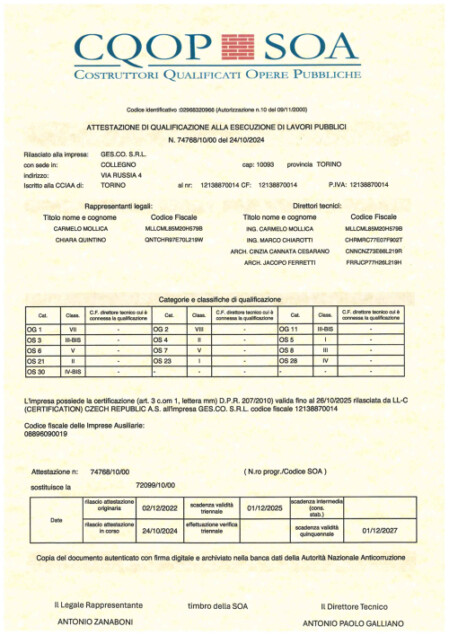 - Certificazione SOA Attestazione N. 74768/10/00 per la realizzazione di opere edili ed impiantistiche per le categorie OG1, OG2, OG11, OS3, OS4, OS5, OS6, OS7, OS8, OS21, OS23, OS28, OS30
