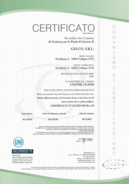 - UNI/PdR 125:2022 con certificato n. CE/302-PdR Ente Certificatore Certifica