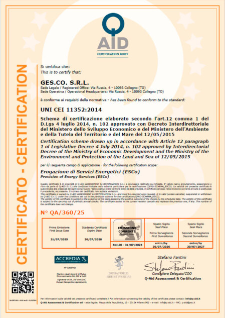 - UNI CEI 11352:2014 con certificato n. QA/360/25 Ente Certificatore Q-AID